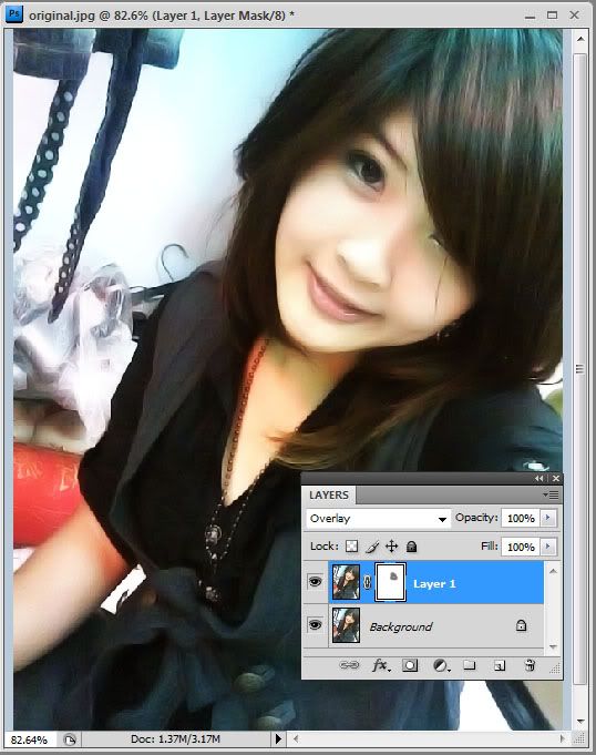Bước 3: Chọn lệnh Image \ Mode \ RGB Color để trở về hệ màu RGB,xong bấm Ctrl - J để nhân đôi layer và chuyển lớp hòa trộn từ Normal thành Overlay (khung ở phía trên bên trái của bảng layer) ta được kết quả như sau: