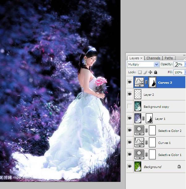 Bước 8: Tạo lớp Curves, để ở chế độ Multiply, giảm Opacity xuống 20%, dùng bút mềm đen xóa bớt màu trên Mod