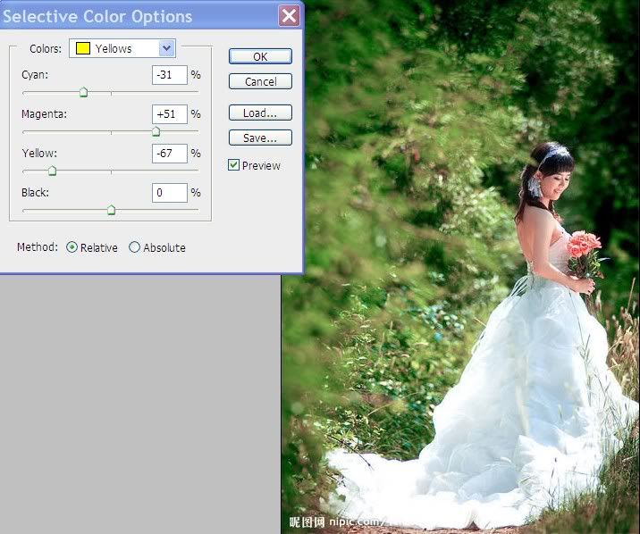 Tiếp đó tạo lớp Selective color bằng cách vào Image->Adjustments/Selective Color....Tại phần Colors bạn chỉnh màu Yellows và màu Greens, đánh dấu các thông số như trong hình